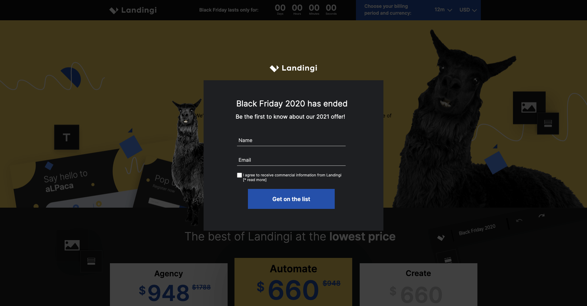 Landing pages are also a great way to pique user interest before launching the actual campaign. You can do it in numerous ways. For example: create a landing page with a glimpse of an upcoming offer. Say a few words about it, include a countdown timer to let people know how much time is left, and add a lead-generating form with a promise (for example: sign up before the countdown ends to get an additional discount or access to the offer before anyone else). We’ve tried such approach with one of our previous Black Friday campaigns and it turned out great.