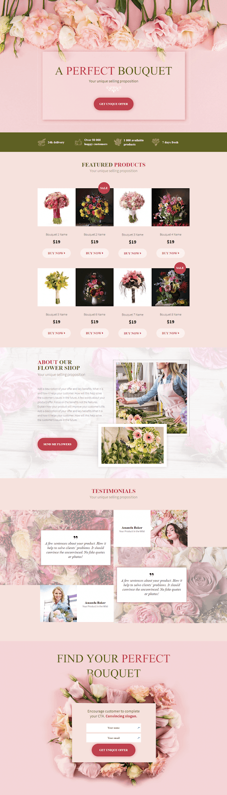 The landing page template seen above is an example of a landing page created for an online flower shop. It has a chic design, subtle colors and a neat structure. It has a feminine look and brings to mind the delicateness of flowers which perfectly fits into the landing page offer.