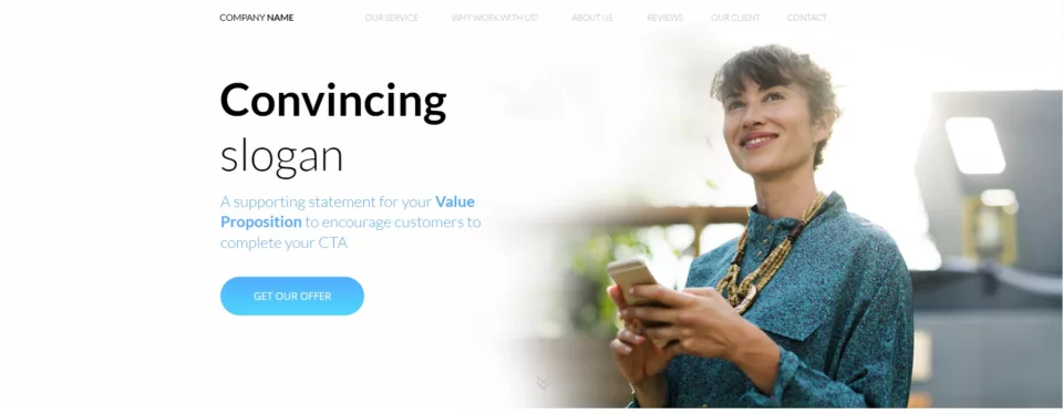 - This landing page has a professional appearance with clean lines and a cohesive color scheme