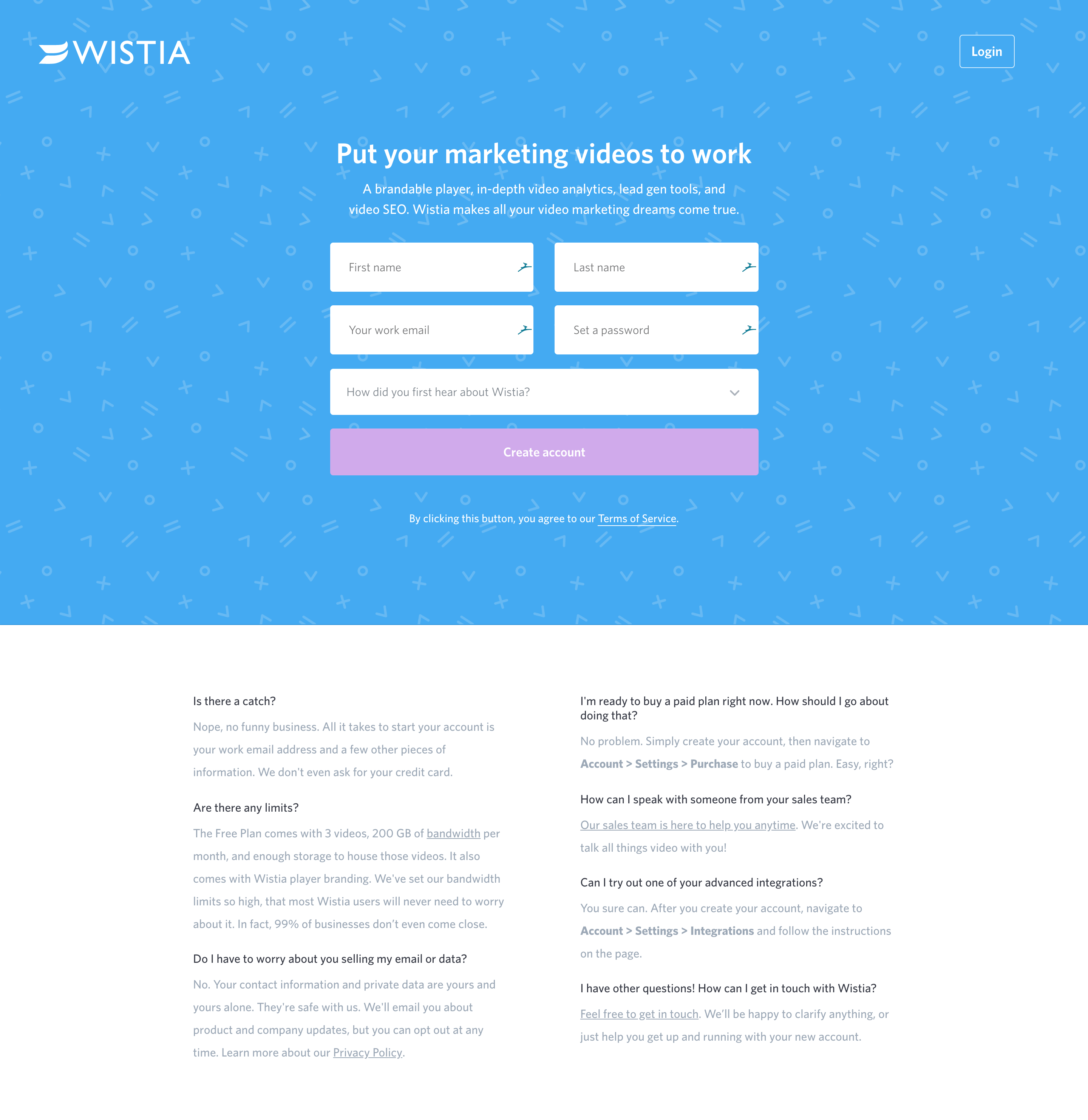 In this great example from Wistia, the form field is in the spotlight. The form is placed right smack in the center against a bright background so that it stands out. It’s brief and short, which also minimizes possible friction visitors may have about creating an account. However, in case you want to learn more, the company does offer snippets of relevant information that you can refer to at the bottom of the page. Again, they’ve made sure it contrasts the rest of the page so the focus is still on the main goal. This helps to reassure visitors of your credibility by providing pertinent information.
