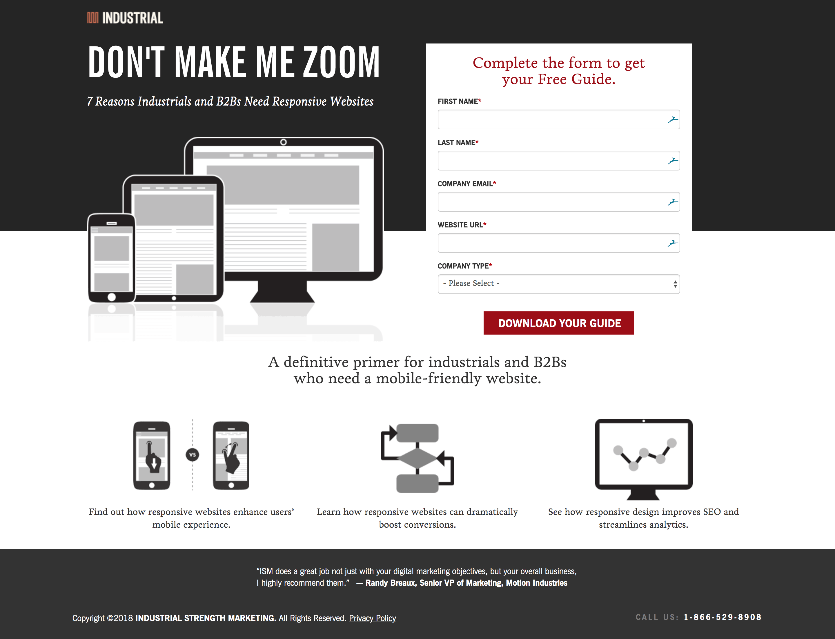 Industrial Health Marketing demonstrates how effective this is for their landing page. Used strategically with contrasting colors, they also manage to draw visitors’ attention to the critical elements of their landing page such as their form field and call to action.