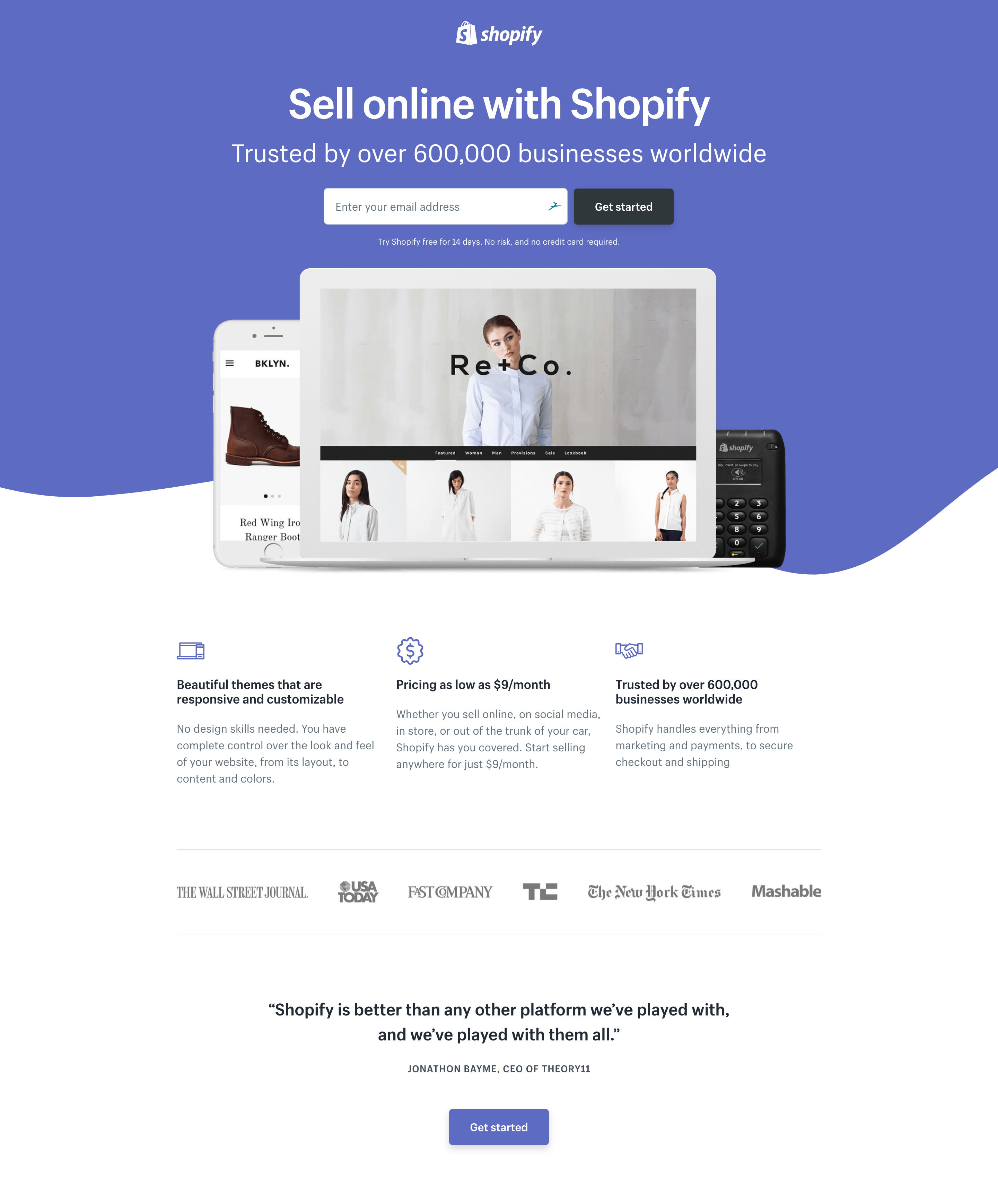 You can check out some great examples of Shopify landing pages that invite visitors to try out their services. By adding a relevant photo, they also manage to add visual interest to their platform while putting the spotlight on their CTA.