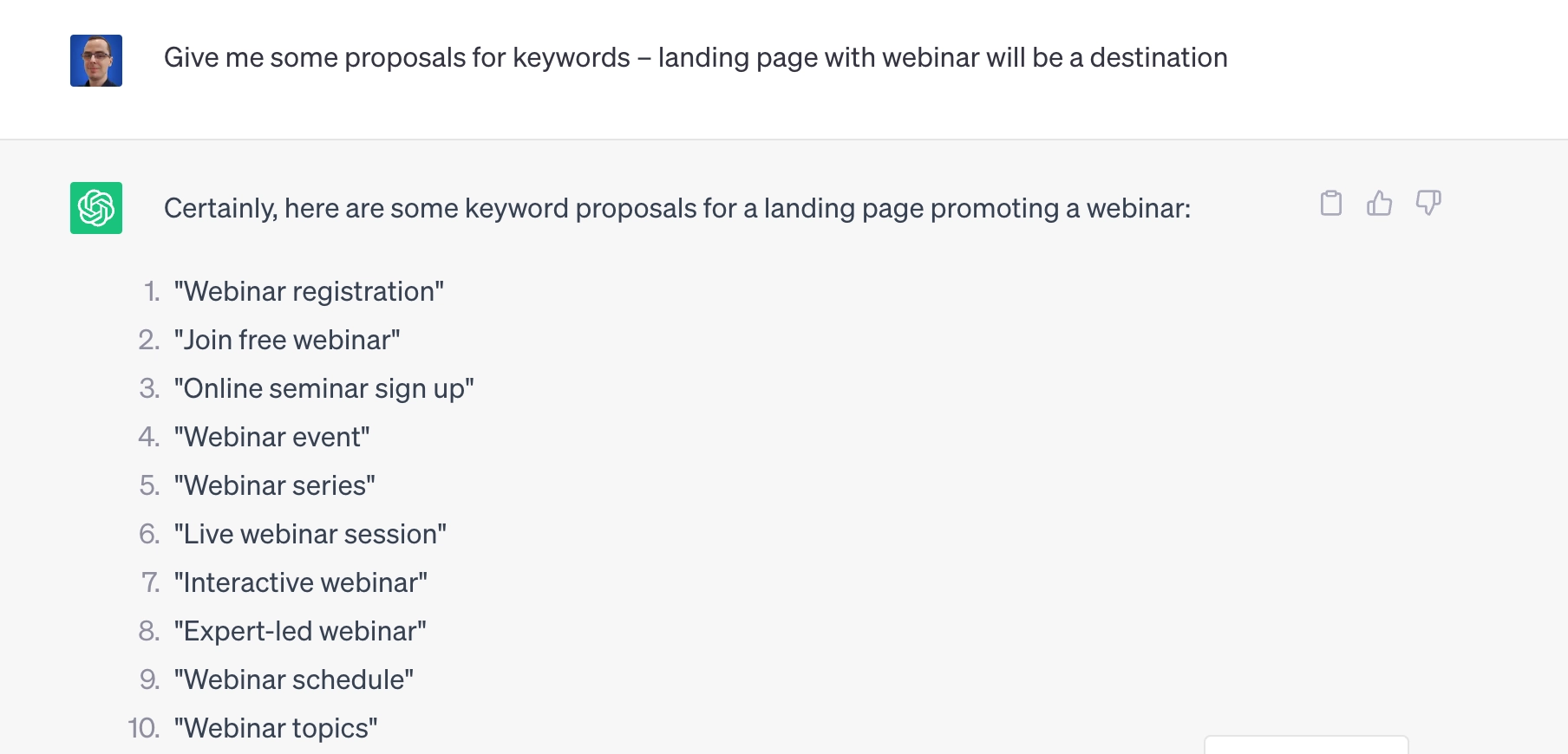 If you have no ideas about how your keywords should look like, you may start by… asking AI tools for some suggestions. ChatGPT, which is (still!) totally free, is more than sufficient. Check out below its proposals for a webinar landing page:
