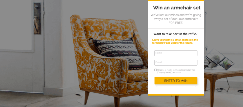 One more option for advertising your brand and product, followed by leads base building, is organizing a contest. This is a time-limited advertising action and landing page suits here perfectly: it presents event rules and promises something in return for entering a contest. Users would participate in it keenly. With great prize promised there would be no objections for users to share their data in higher than usual amount.