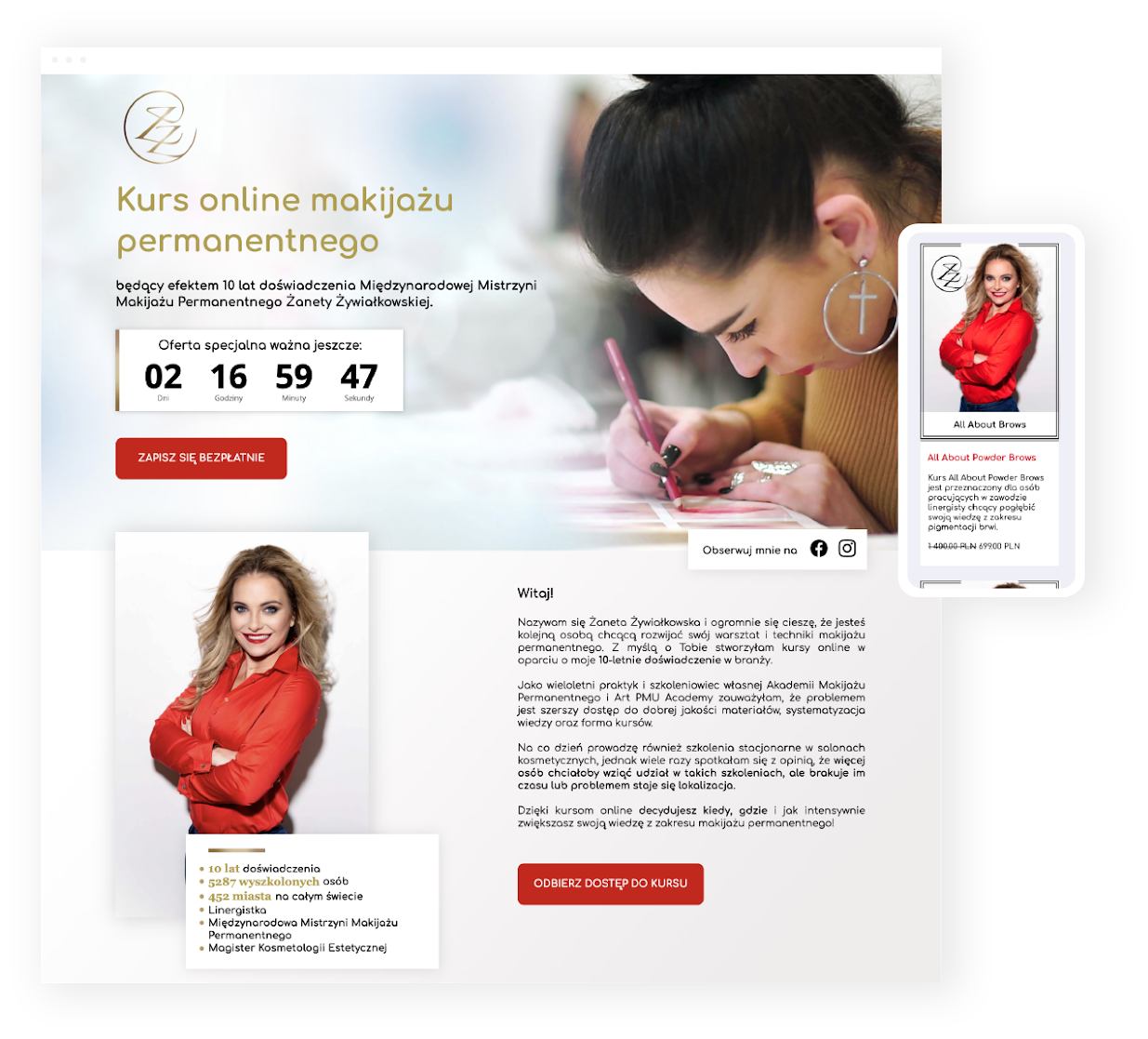 Landing page, made by us for Żaneta Żywiałkowska’s permanent makeup courses, stands out with elegant yet light and pleasant aesthetics and colors. However, it was not only the design that made the landing page successful. We supported it with a comprehensive advertising campaign.
