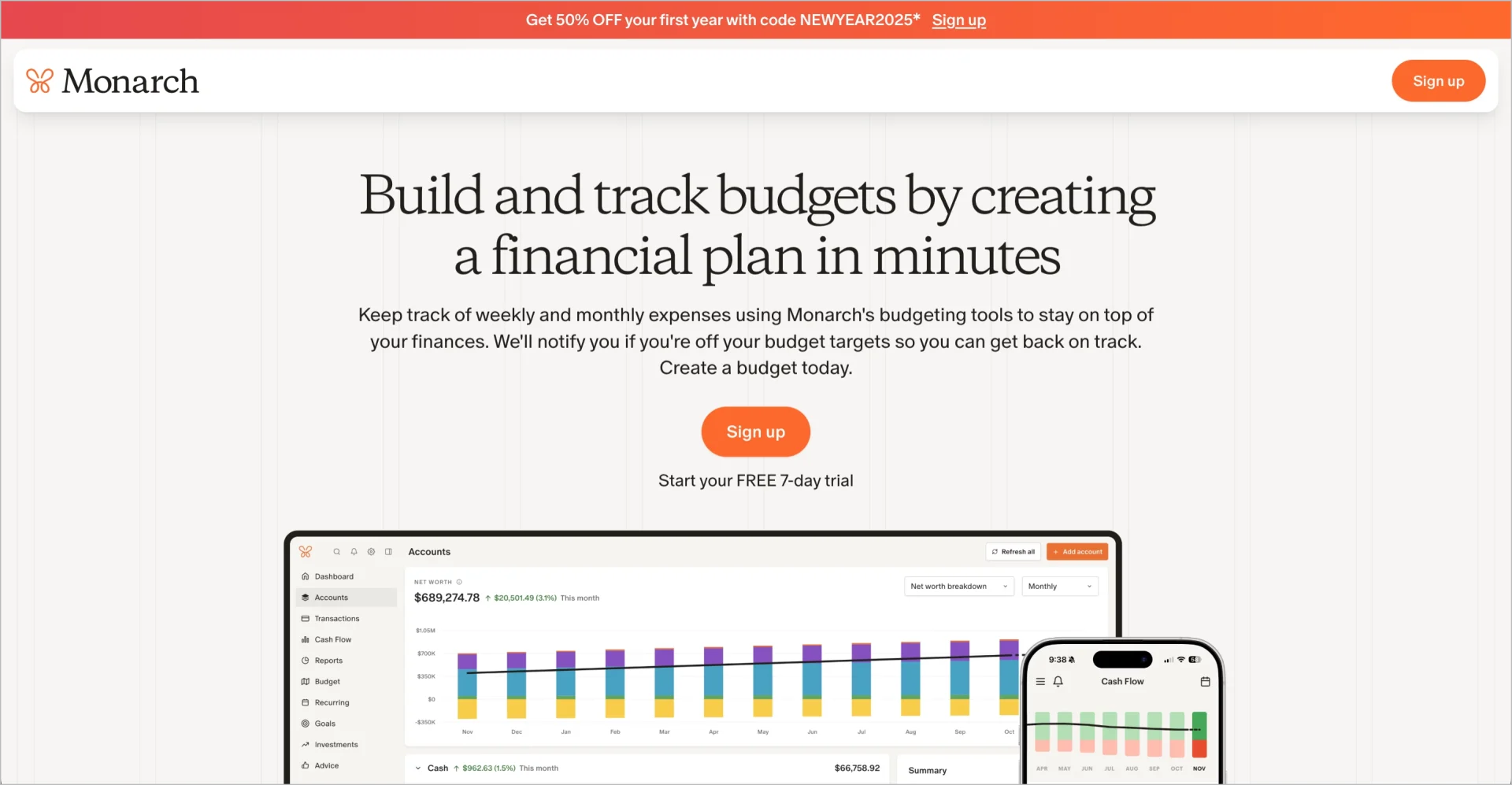 The Monarch Money budgeting tools landing page is an excellent example of a finance-focused landing page that effectively promotes financial management software. The page immediately establishes credibility by showcasing trust signals, such as recognition from Forbes, The Wall Street Journal, and The Motley Fool, reinforcing its position as a leading budgeting tool. The headline and subheadline clearly communicate the platform’s value: “Build and track budgets by creating a financial plan in minutes.” The call-to-action (CTA), “Sign up,” is prominent, paired with an attractive offer of a 7-day free trial.