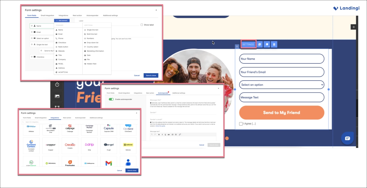 - Landingi offers a robust form builder with multi-step logic, hidden fields, custom confirmation flows, and direct integrations. Pop-ups are fully editable with built-in templates and can be triggered by time, scroll, or user interaction. This makes Landingi especially strong for targeted conversion strategies and tailored lead capture.