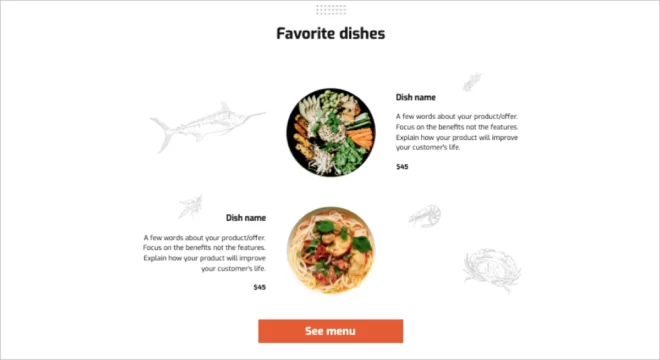 Das sechste Schlüsselelement eines Restaurants Landing Page ist ein Menübereich. Die Präsentation von Vorzeigegerichten oder die Verfügbarkeit einer vollständigen Speisekarte gibt einen Vorgeschmack auf das Angebot des Restaurants und ermutigt die Gäste, eine Reservierung vorzunehmen oder online zu bestellen.