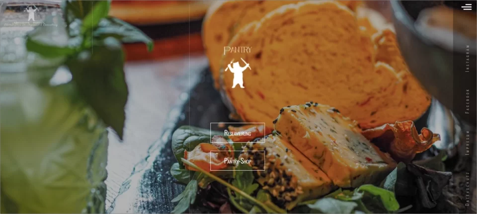 Die Seite des Restaurants Pantry ist ein Beispiel für eine minimale Landing Page, die sich auf einen einzigen Punkt konzentriert und die Besucher dazu bringt, die Aktion abzuschließen. Sie ist auf einem animierten Hintergrund aufgebaut, der die farbenfrohen, schmackhaft aussehenden Speisen, die Inneneinrichtung des Restaurants und die einzigartige Atmosphäre präsentiert. In ihrer Einfachheit enthält die Seite ein Restaurantlogo und einen CTA-Button für die Tischreservierung im mittleren Teil.