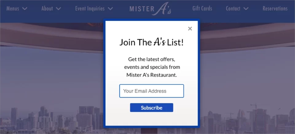 Die zweite bewährte Methode für ein Restaurant Landing Page ist die Verwendung eines Popups mit einem einzigen Opt-in-Formular. Wenn der Hauptzweck Ihrer Seite darin besteht, die E-Mail-Adressen der Besucher für weitere Marketingkampagnen zu sammeln, ist die Implementierung eines gut gestalteten Popups der beste Weg, um Leads zu generieren.