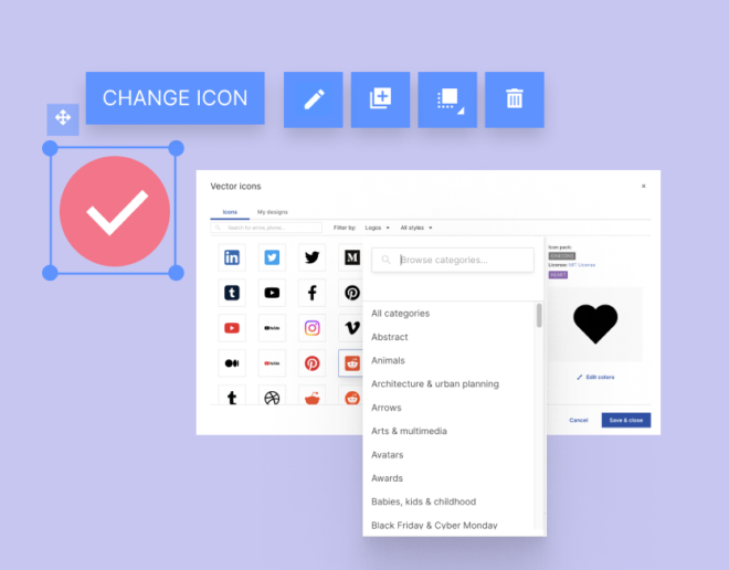 Heben Sie wichtige Momente hervor und machen Sie Ihre Botschaft ansprechender und intuitiver. Wählen, bearbeiten und fügen Sie Icons zu Ihren Seiten mit Iconfinder-Icons hinzu.