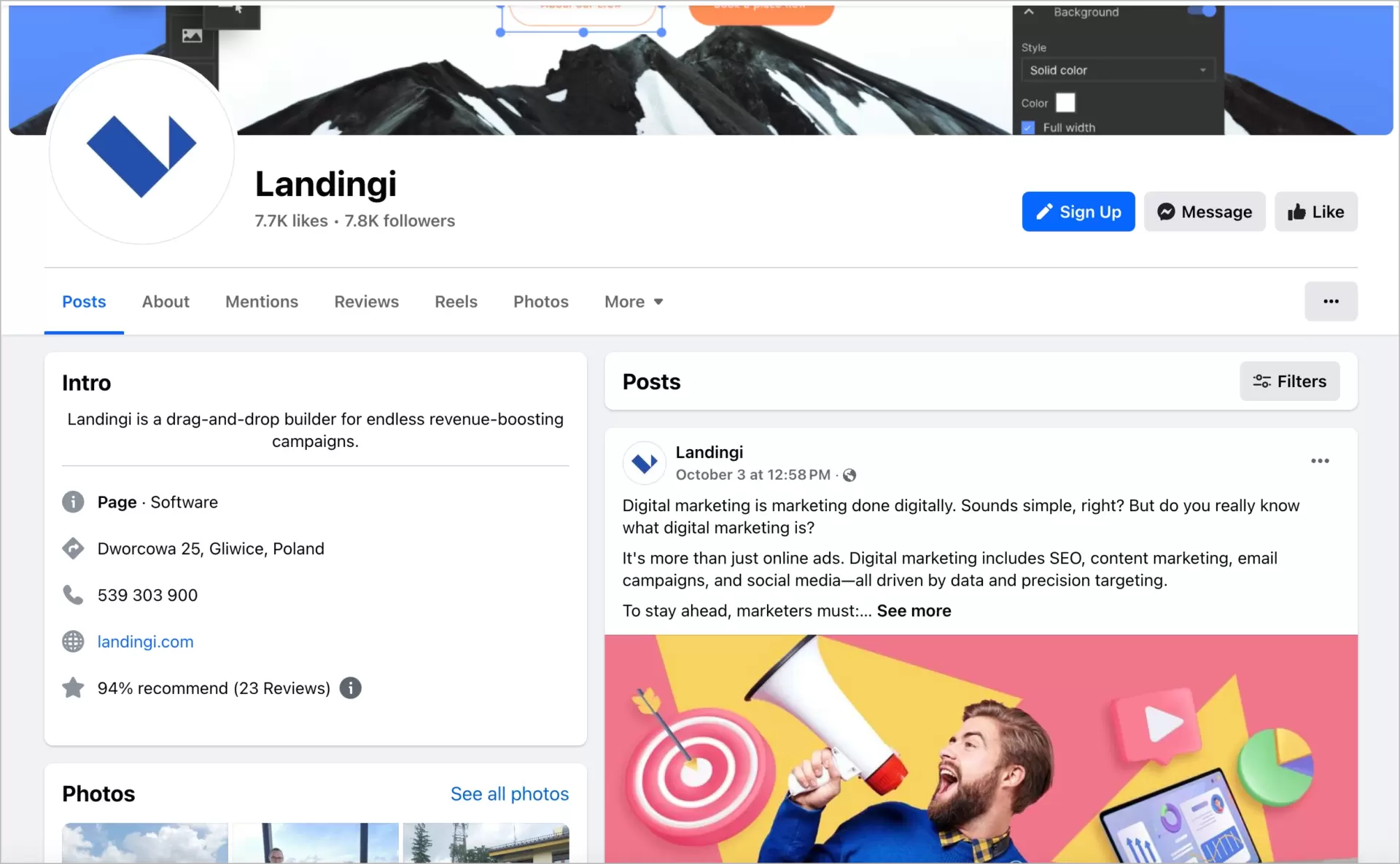 Landingi también realiza campañas de marketing por correo electrónico (con boletines informativos y actualizaciones de productos como dos tipos principales de cartas en uso), seminarios web y marketing de afiliación, que son tipos de marketing digital. Además de todo esto, la empresa utiliza plataformas de redes sociales, que también son un tipo de marketing digital.