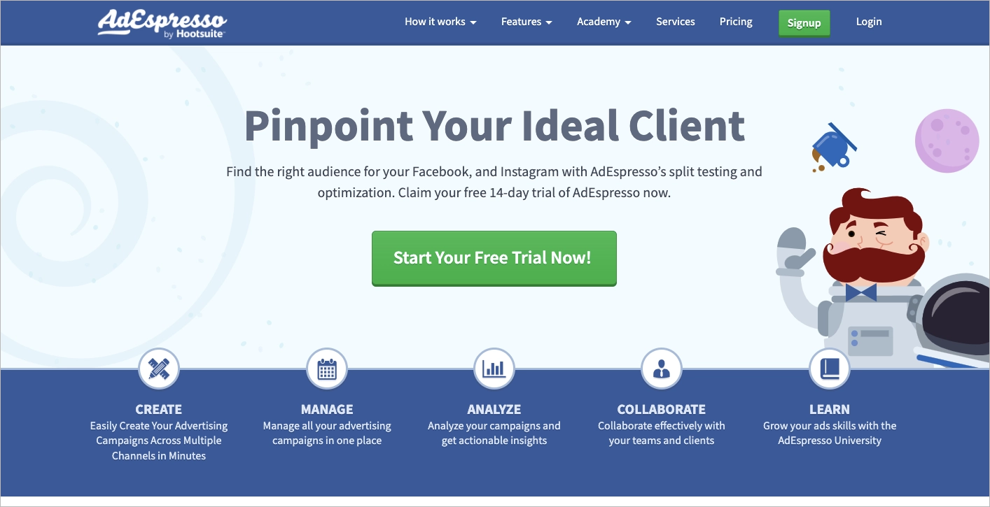 AdEspresso de Hootsuite es una herramienta de gestión de anuncios que simplifica la creación, gestión y optimización de Facebook y Google Ads. Su interfaz está diseñada para facilitar su uso, por lo que es apta tanto para profesionales del marketing noveles como experimentados.