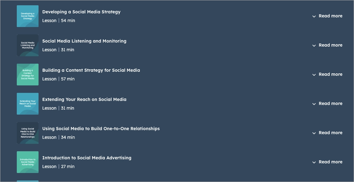 La Certificación en Marketing en Redes Sociales de HubSpot es uno de los mejores cursos gratuitos disponibles para principiantes que buscan construir una base sólida en marketing en redes sociales. Con 10 lecciones concisas y más de 5 horas de contenido, el curso le guía a través de conceptos clave como: