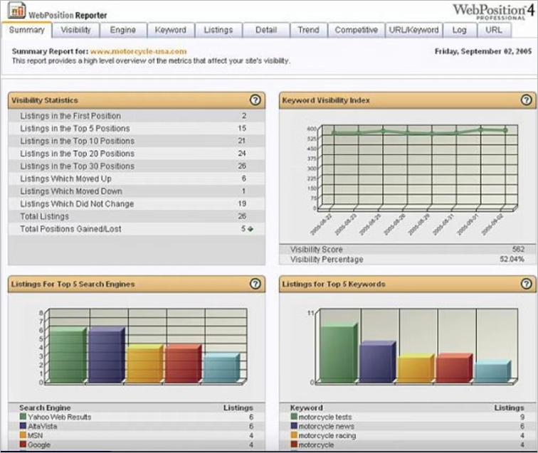 L’un des premiers véritables outils SEO a été WebPosition Gold, lancé en 1997 pour aider les webmasters à suivre le classement des moteurs de recherche, à rechercher des mots-clés et à soumettre des sites web à plusieurs moteurs de recherche.