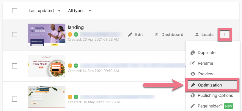 1. Log in to your Landingi account. Click More (three dots icon) next to your landing page and select Optimization.