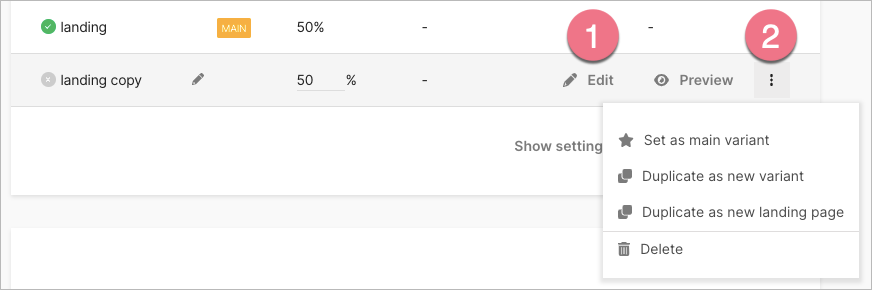 3. Click More (three dots icon) next to a landing page variant and select Set as main variant.