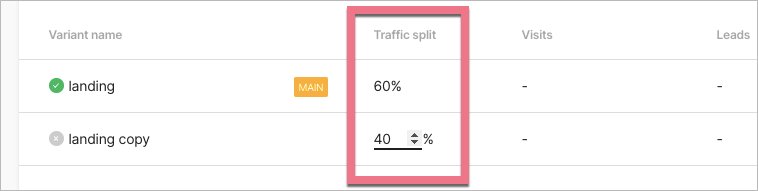 1. You can manually specify the traffic split for each variant. To do this, click on the percentage box and enter the appropriate value.