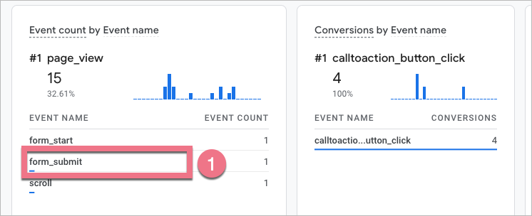 6. From now, your Google Analytics 4 will be capable of tracking two button-click events. You will see the first data in GA4 right away in Reports > Realtime > Event count.
