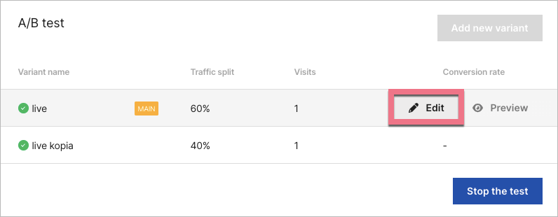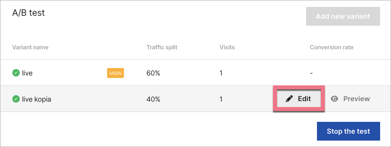 2. Create a landing page variant for A/B/x testing. Navigate to its editor.