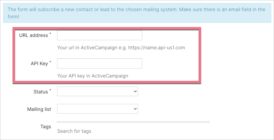 Status, Mailing list, and Tags, if predefined in the ActiveCampaign platform, will load automatically after successful login. You can change them at any time depending on your needs.