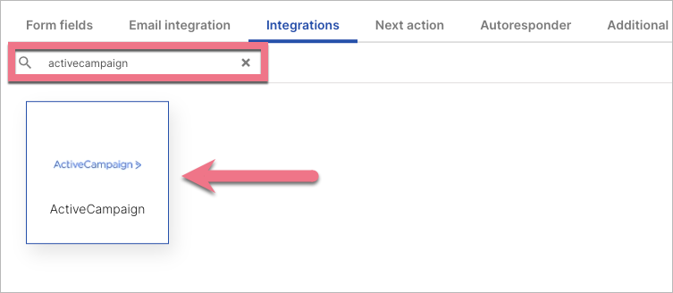 3. Go to the Integrations tab and select Active Campaign. You can use the search bar to look for the integration. Type the name and press enter.