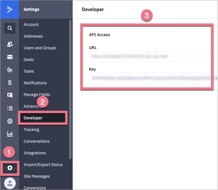 4. Log in to your account in the ActiveCampaign platform. In the side menu on the left, go to Settings (1) > Developer (2) and copy the URL and key (3).