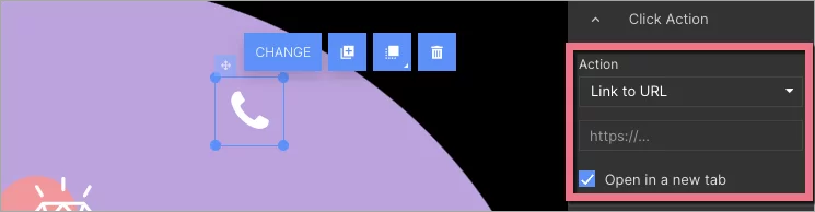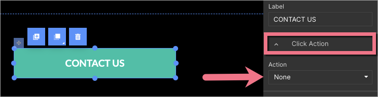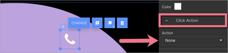 2. Click on the icon or image. In the right-side toolbar, find the Click Action tab and unfold the Action menu.