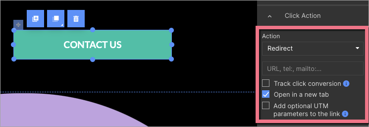 2. Click on the button. In the right-side toolbar, find the Click Action tab and unfold the Action menu.