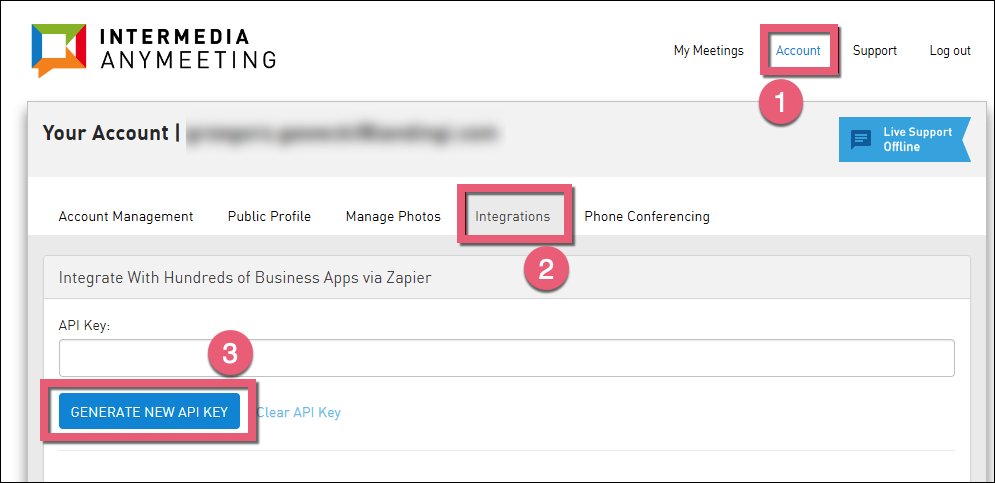 2. When connecting AnyMeeting and Landingi, you will need AnyMeeting API Key. To find it, click on the Account (1) tab, choose Integrations (2), and click Generate New API Key (3).
