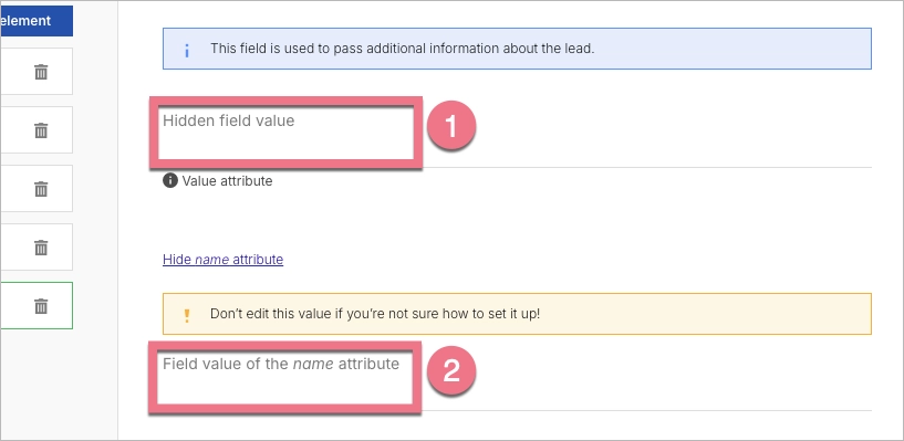 5. Paste the code as the Hidden field value (1). Click “Show name attribute” and change it to Webinar-Code (2).