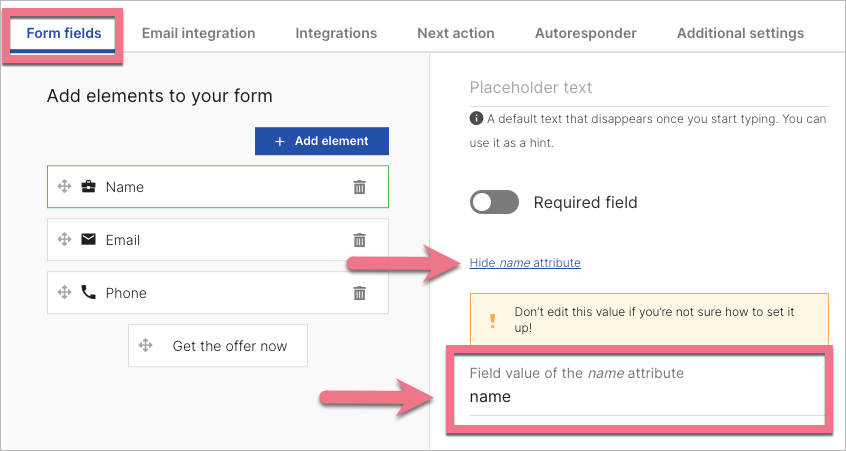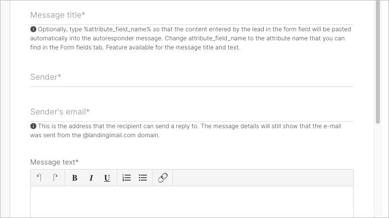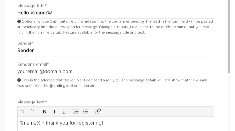 4. Optionally, type %field_value_of_the_name_attribute% (changing field_value_of_the_name_attribute to the name attribute, which you can find in the Form fields tab) so that the content entered by the lead in the form field will be pasted automatically. You can use this feature in the message title and the message text.
