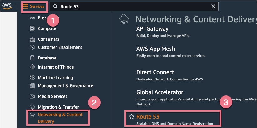 2. Go to the Route 53 (3) console – click on Services (1) > Networking & Content Delivery (2), or use the search bar at the top.