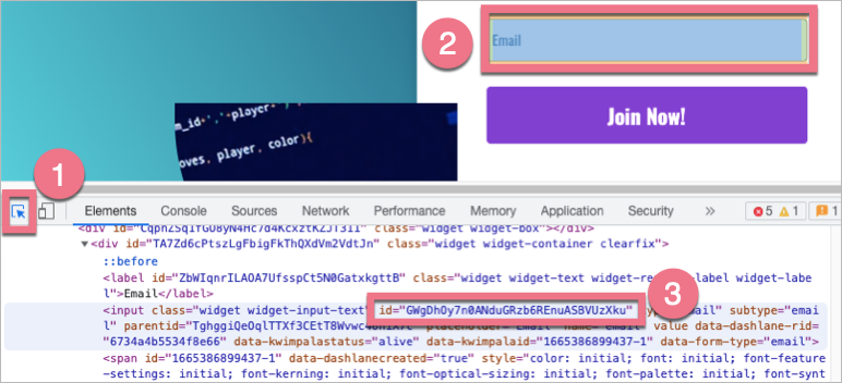 2. An HTML code window will open. Click on the select tool (1) and hover over the email field (2). The part of the code relevant to the field will be highlighted. Copy the email field ID (3).