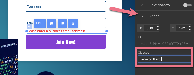 10. Then go to the Other tab in the right-side toolbar. Type keywordError in the Classes field.