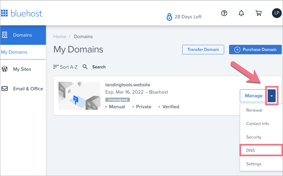 Access the DNS management zone in Bluehost