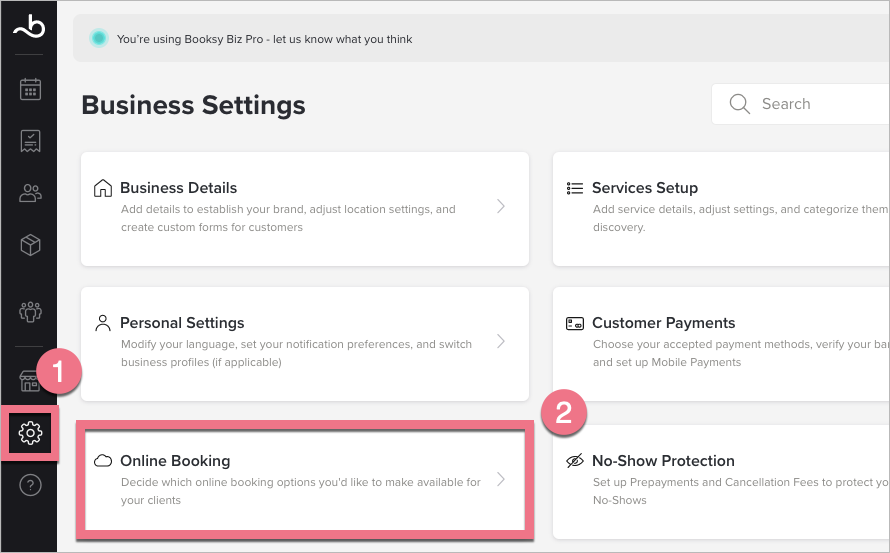 2. Go to Settings (1) and choose Online Booking (2).