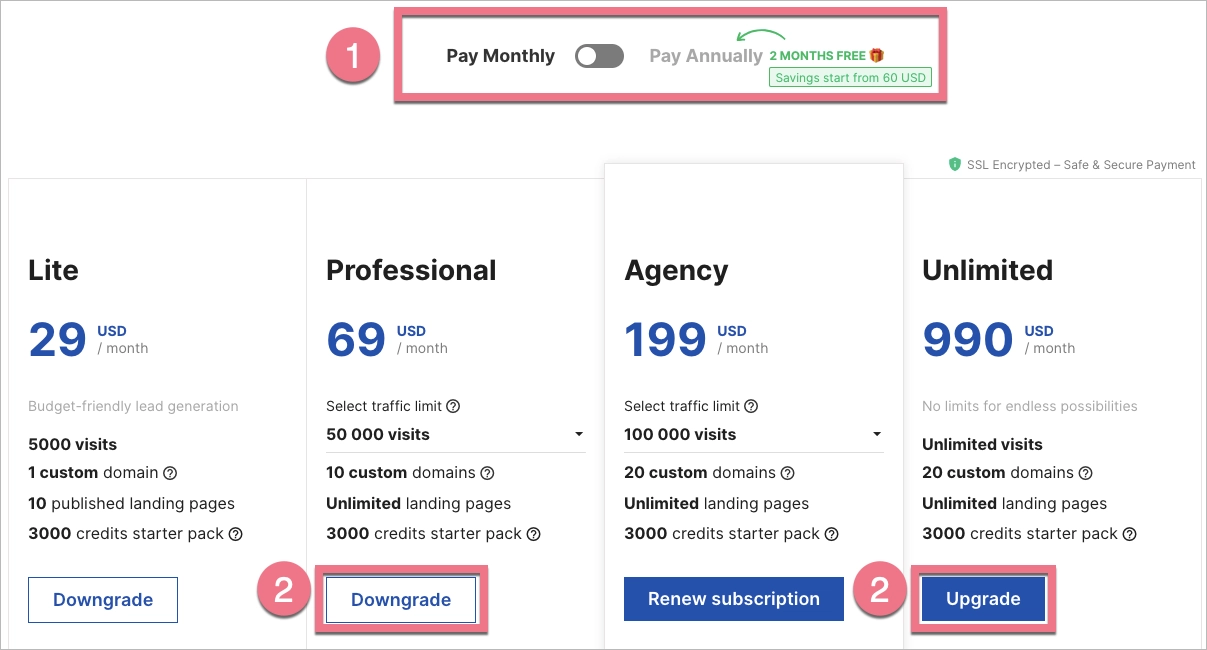 4. Choose the billing method (1) and decide if you want to downgrade or upgrade (2).