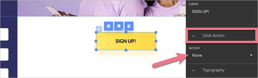 2. Click on a button and find the Click Action tab in the right-side toolbar. Unfold the Action menu.