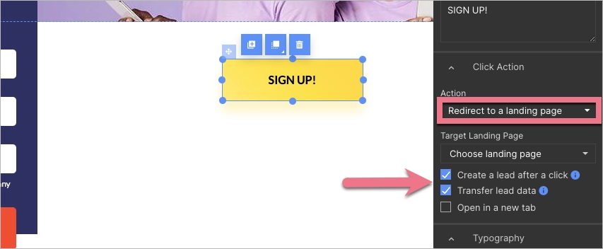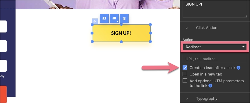 3. Select Redirect or Redirect to a landing page, and check Create a lead after a click. If this landing page is a part of a funnel, check Transfer lead data as well.