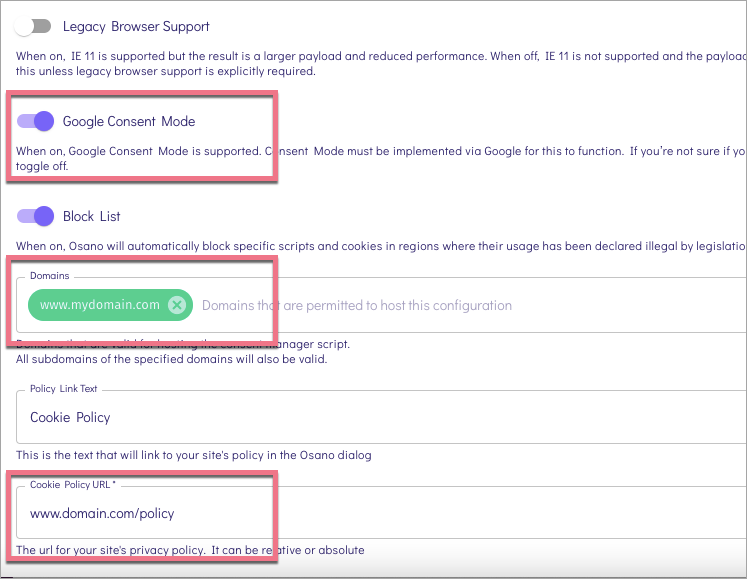 Select Google Consent Mode. Paste your domain – you can enter either a root domain or a subdomain; Osano automatically works with subdomains of your website with no additional configuration. Paste the URL with your landing page’s policy.