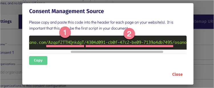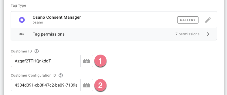 6. In Customer ID (1) and Customer Configuration ID (2) fields, paste values copied from your Osano code.