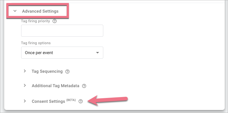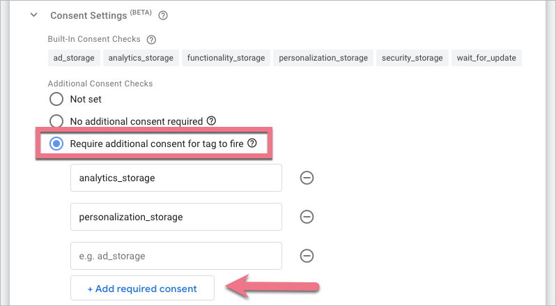8. Set up additional consent that is needed for the tag to fire. Click Add required consent to add new. Go to Google Help to learn more about consent settings.