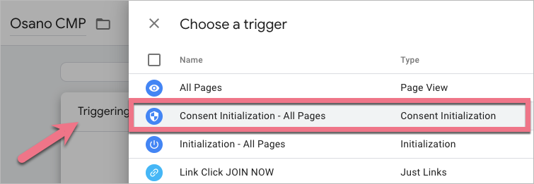 9. Scroll down and click Triggering. Choose Consent Initialization – All Pages. Then save the changes.