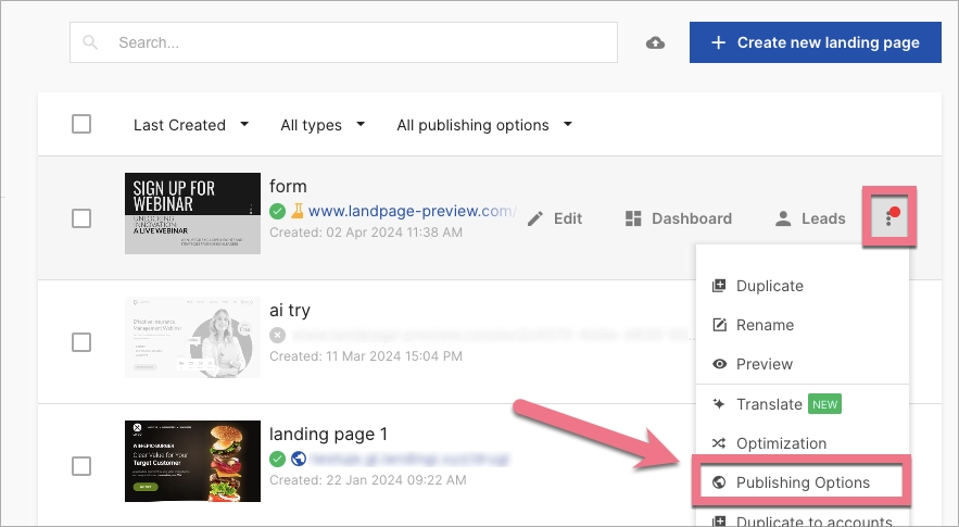 1. Go to the Landingi tab and find your landing page on the list.
