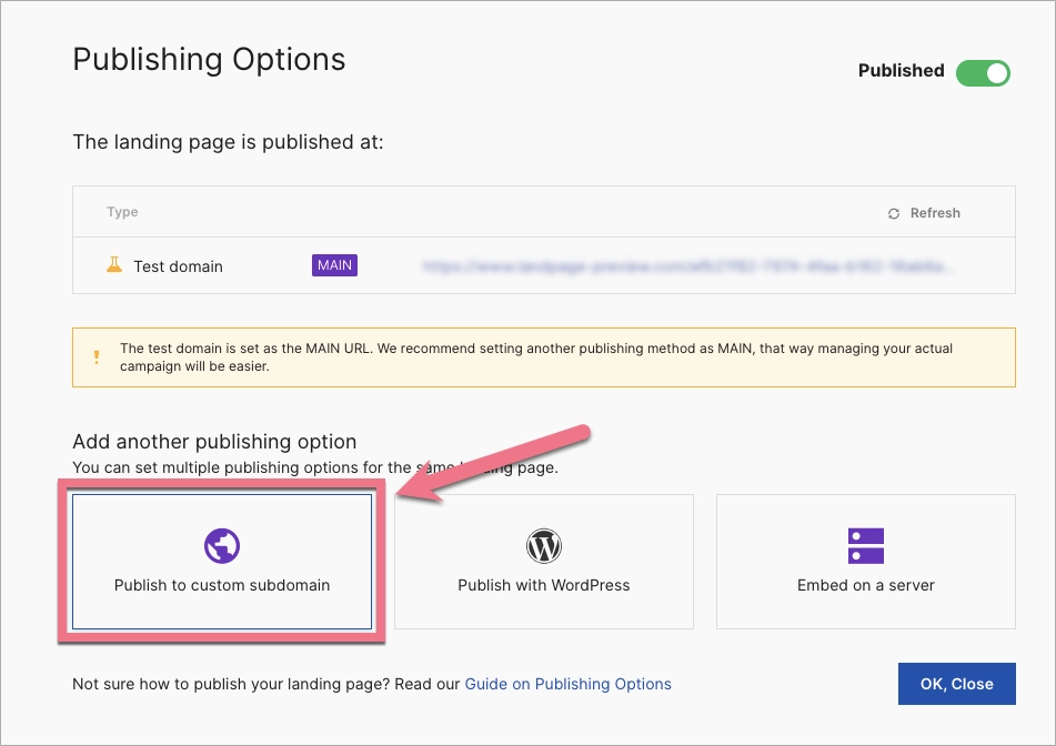 If you haven’t assigned a custom subdomain to your landing page, click on Publish to custom subdomain.