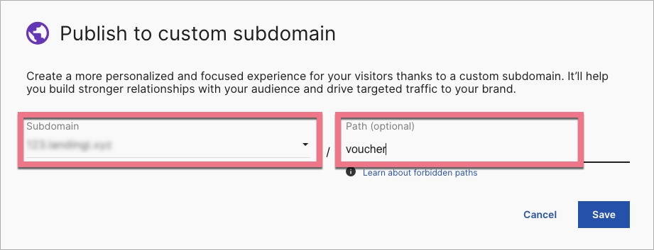 You can publish your landing page to a subdomain with a subfolder (a path). The URL will look like something this: myportfolio.mywebsite.com/voucher, myportfolio.mywebsite.com/limitedoffer, myportfolio.mywebsite.com/event. Pages published to a URL with a path are not counted as a new subdomain, but you can only add paths to a subdomain that has already been redirected to Landingi. There’s no limit as to how many landing pages can be published to a path.
