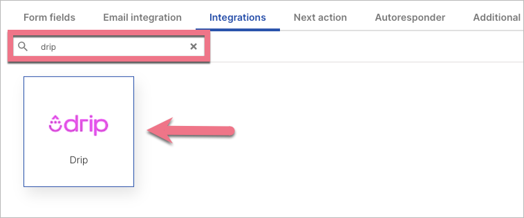 3. In the Integrations tab, choose Drip. You can use the search bar to look for the integration. Type the name and press enter.