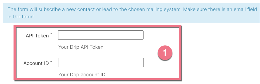 4. In the corresponding fields (1), paste the API Token and Account ID from Drip.