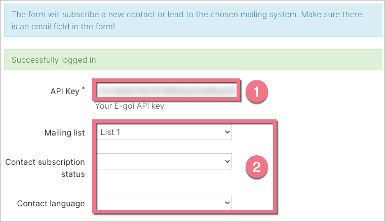 4. In the API key field (1), paste your key copied from E-goi. Enter other data (2).